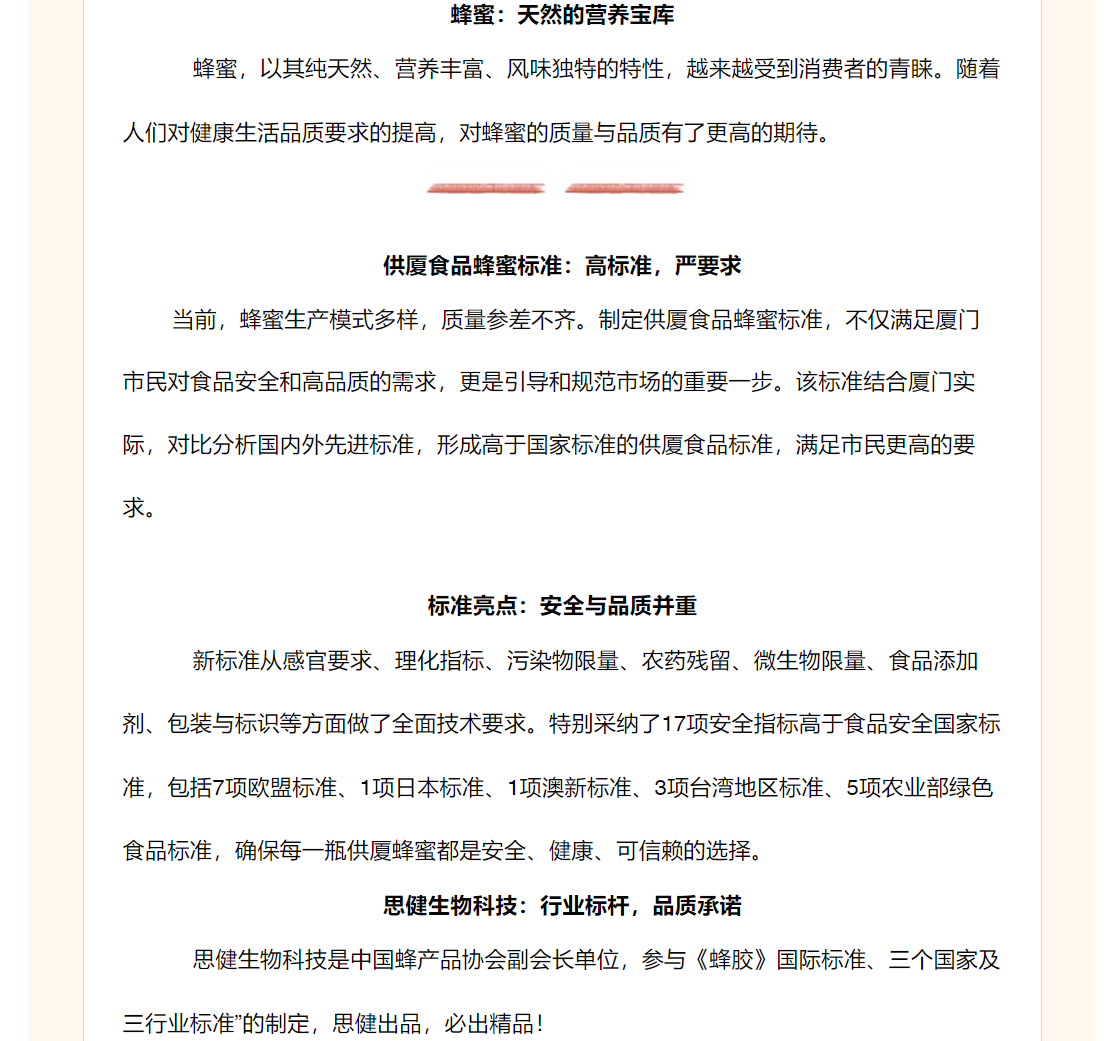 快訊:供廈標準《供廈食品 蜂蜜》 2024-9-30發(fā)布實施 思健生物科技很榮幸參與該標準制定